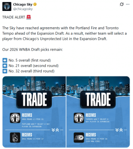 Prior to the draft, the Chicago Sky conducted trades with both teams in order to protect their players. The Sky traded the No. 17 pick to the Fire in exchange for the No 21 pick in the 2026 draft and not selecting their unprotected players. They traded the No. 26 pick to the Tempo so they wouldn’t choose any of the Sky’s unprotected players.